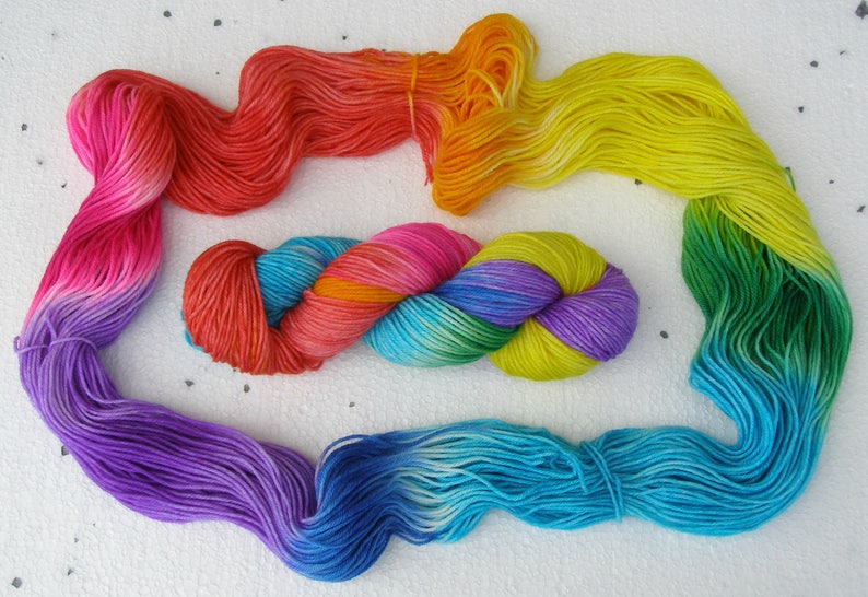 Handspun Neon Yarn, hand dyed, merino, plied, thick and thin yarn, rainbow, unicorn guts ...